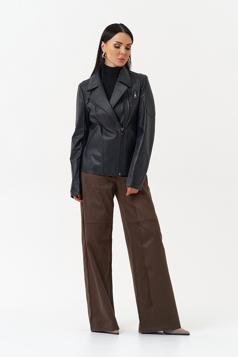 Длина изделия - 60 см;Длина рукава - полный;Цвет -синий;Материал - натуральная кожа;Фасон - приталенный;Вид застежки - молния;Вид ворота - стойка