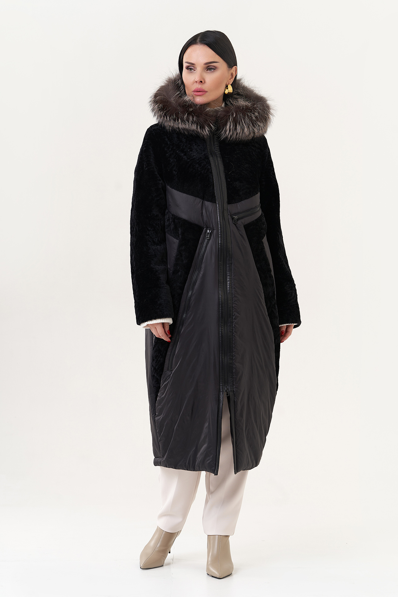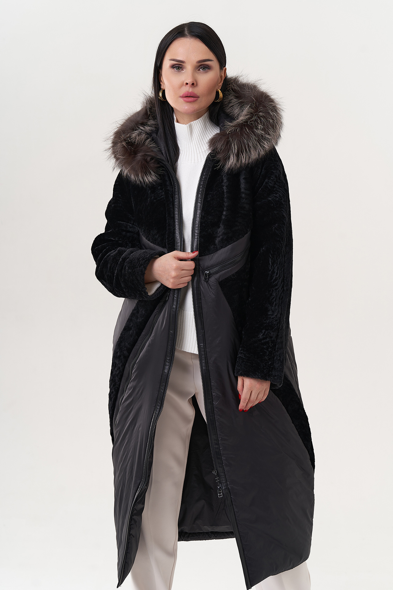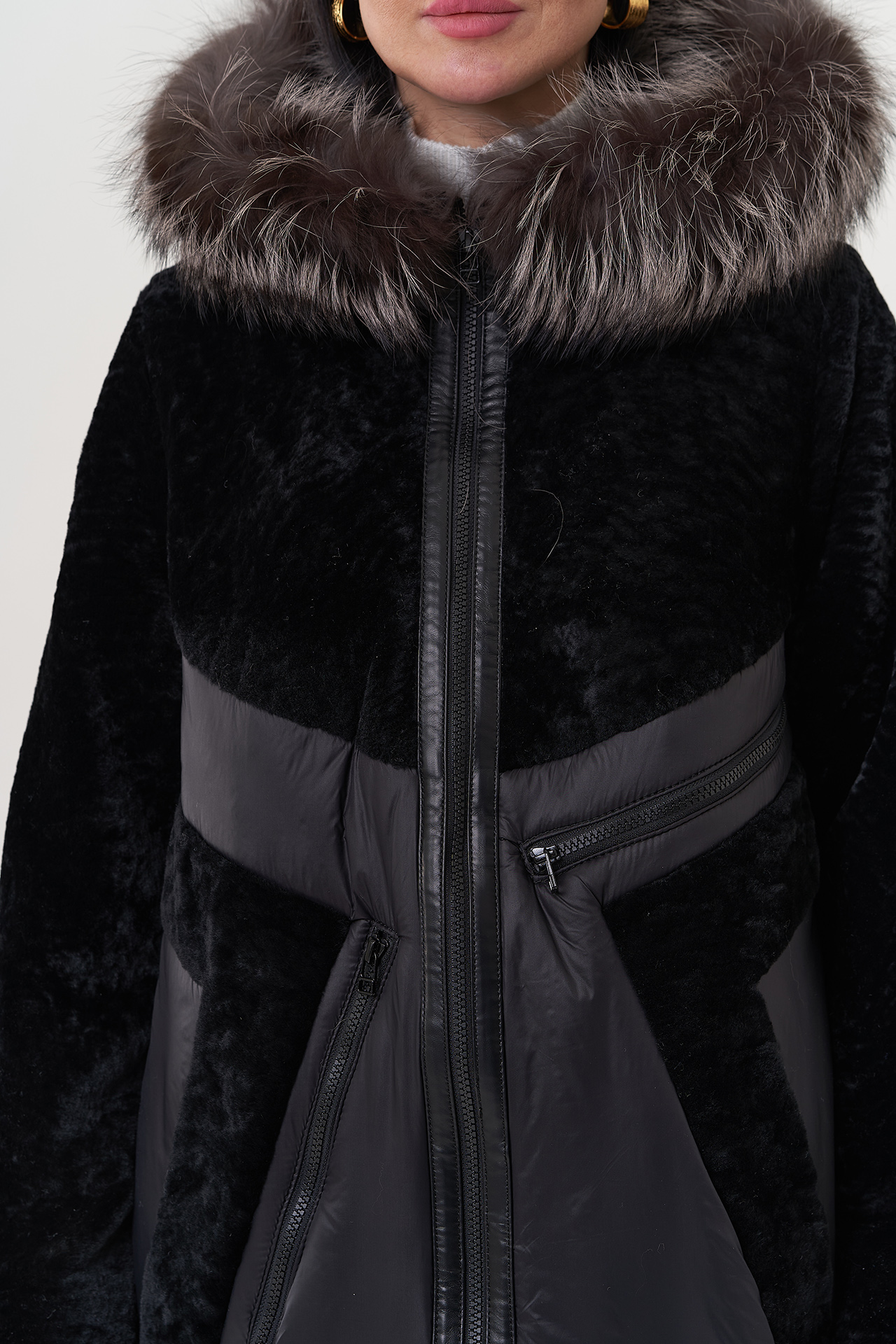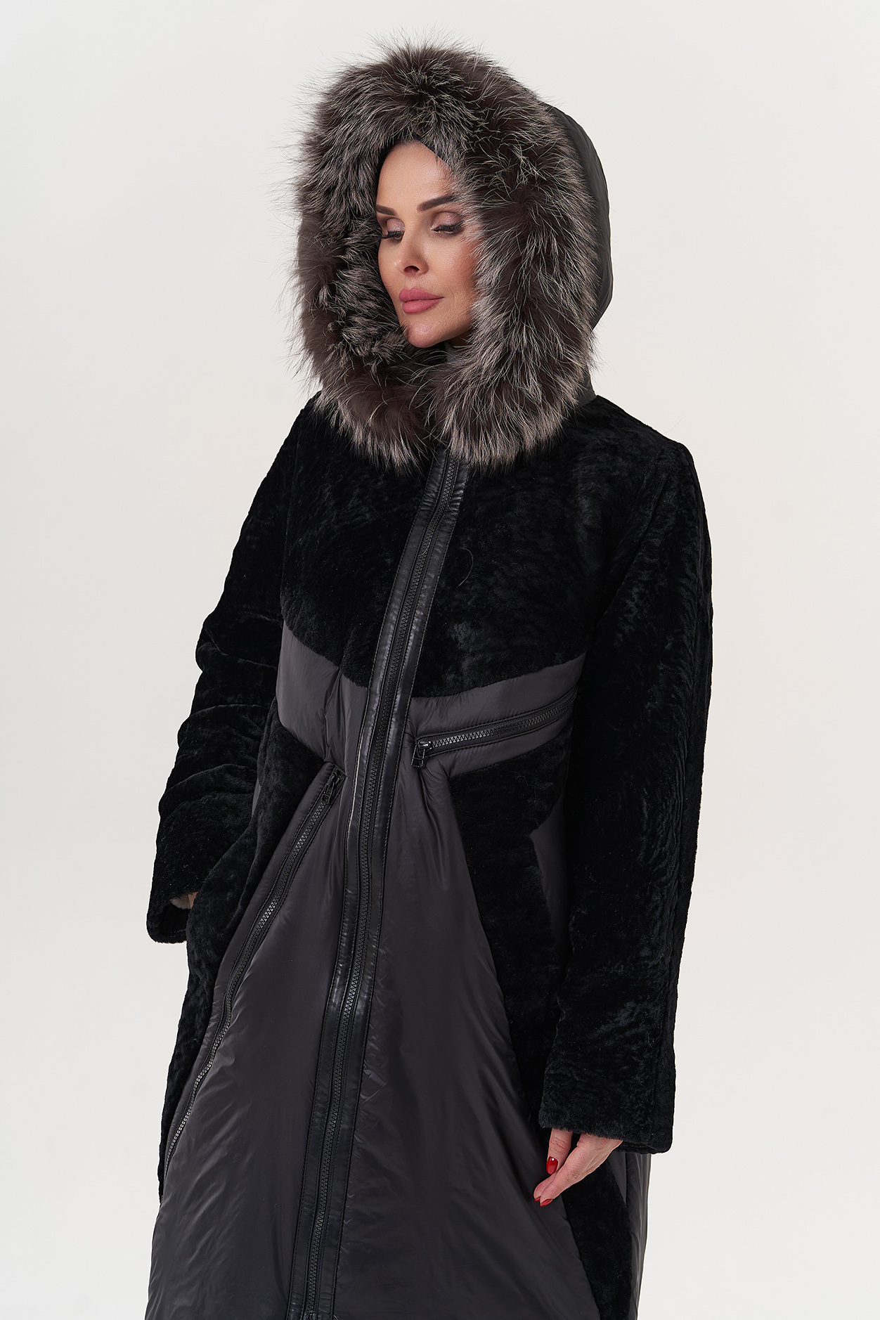 Вид ворота - капюшон, отделка - чернобурая лиса