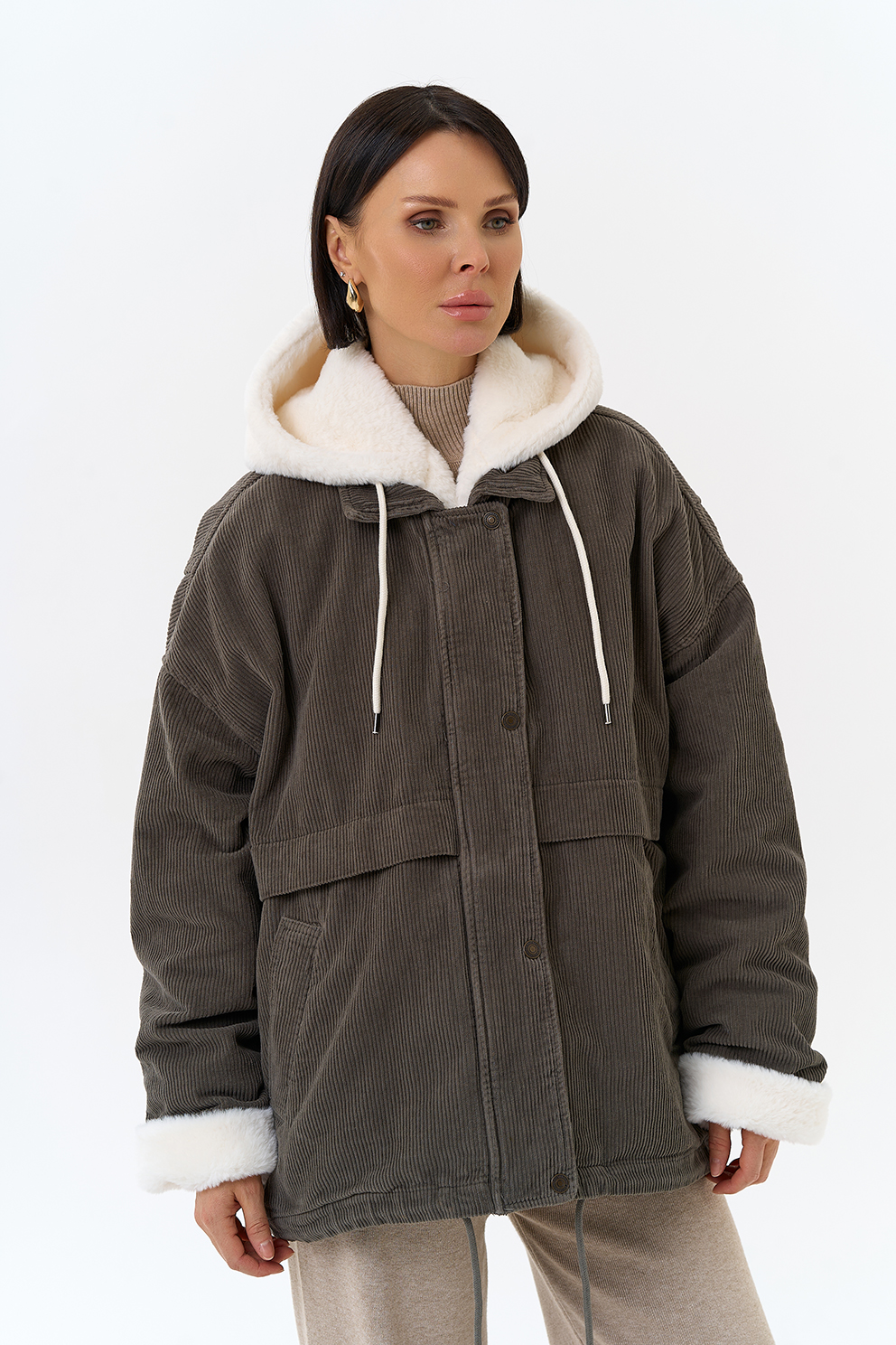 Крой воротника - съемный капюшон, отделка эко мех