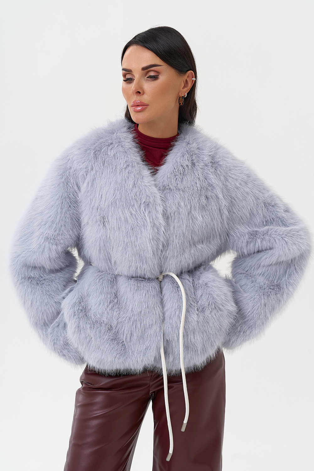 Фасон - прямой Длина изделия - 60 см Цвет - голубой Материал - экомех Состав полотна - полиэстер 100% Подкладка - полиэстер 100% Вид застежки -крючки, пояс Вид ворота - V-образный Фасон рукава - спущенное плечо, длинный |