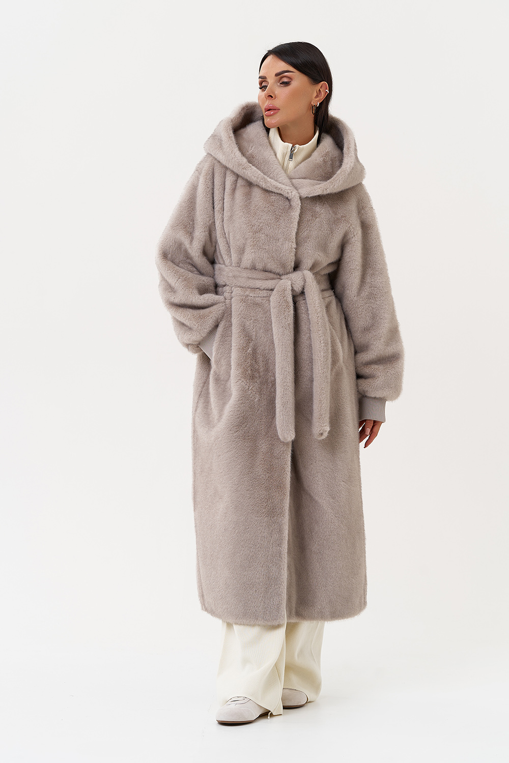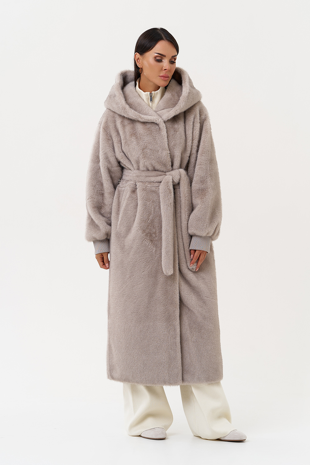 Фасон - прямой Длина изделия - 120 см Цвет - серый Материал - экомех Состав полотна - полиэстер 100% Подкладка - полиэстер 100% Вид застежки - молния, пояс, кулиска на талии Вид ворота - капюшон Фасон рукава - спущенное плечо, длинный |